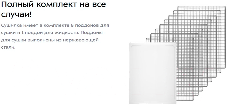 • Количество противней 9 (8 металлических сеток,1 поддон)