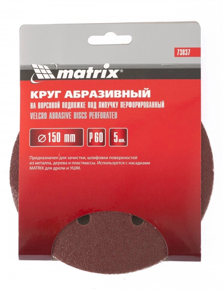 Круг абразивный на ворсовой подложке под "липучку", перфорированный, P 40, 150 мм, 5 шт Matrix