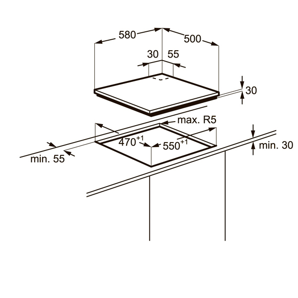 - Ширина встраивания, в см 55