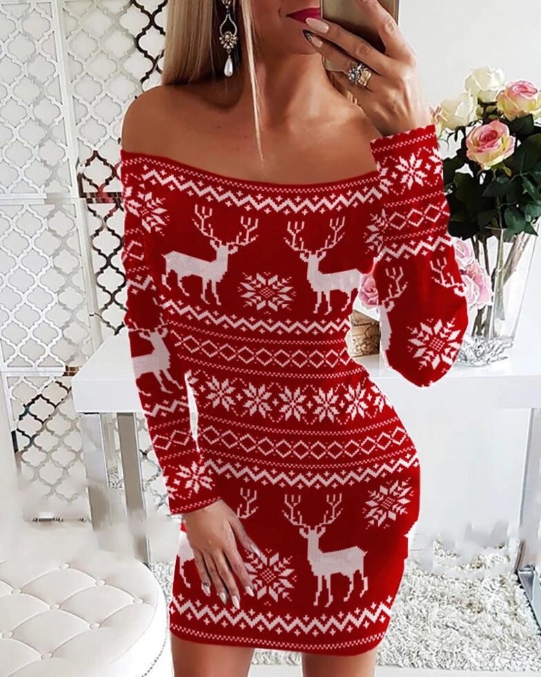Christmas Off Shoulder Deer Snowflake Print Bodycon Dress Long Sleeve Slim Fit Elegant Skinny Dress