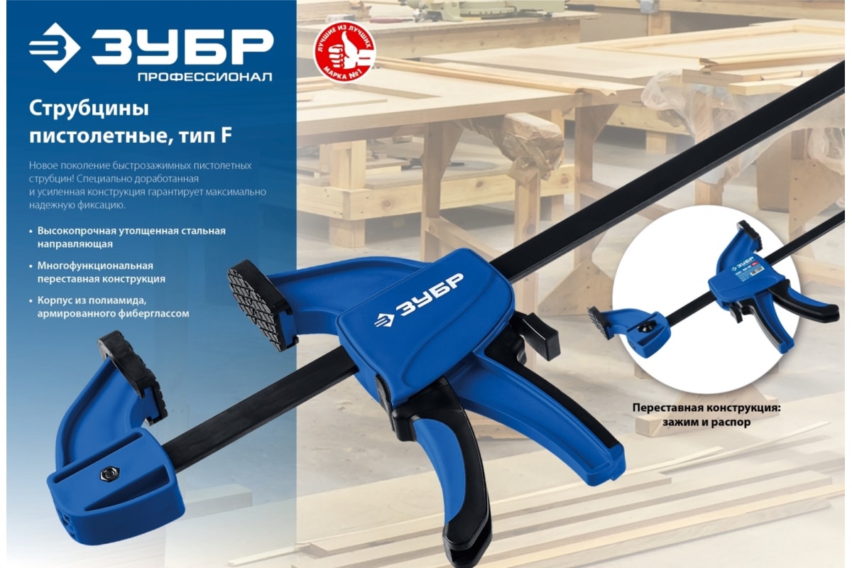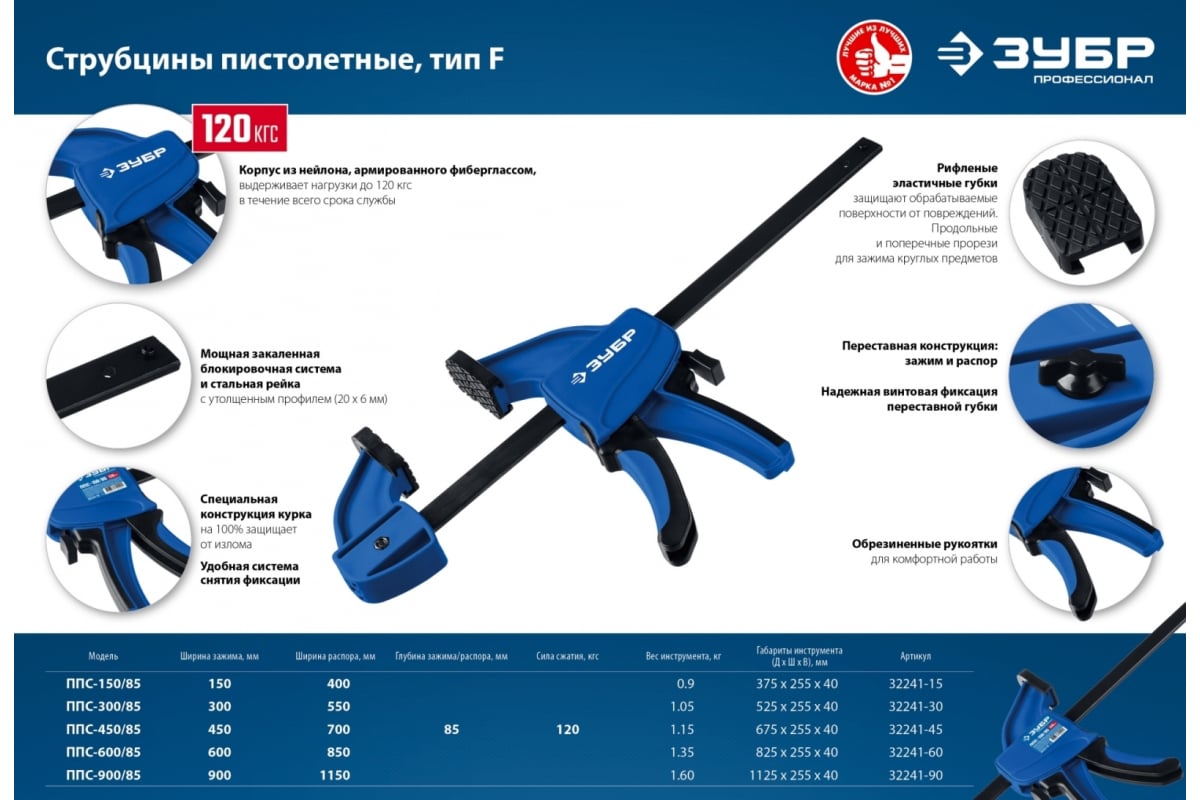 Пистолетная струбцина ЗУБР ППС-450/85 450х85 мм 32241-45 представляет собой профессиональный инструмент с усиленной конструкцией для зажима деталей при проведении различных работ. Конструкция струбцины гарантирует максимально надёжную фиксацию. Благодаря прочному корпусу инструмент выдерживает нагрузки до 120 кг в течение всего срока службы. Специальная конструкция курка защищает от излома. Рифлёные эластичные губки защищают обрабатываемые поверхности от повреждений. Продольные и поперечные прорези позволяют зажимать круглые предметы.