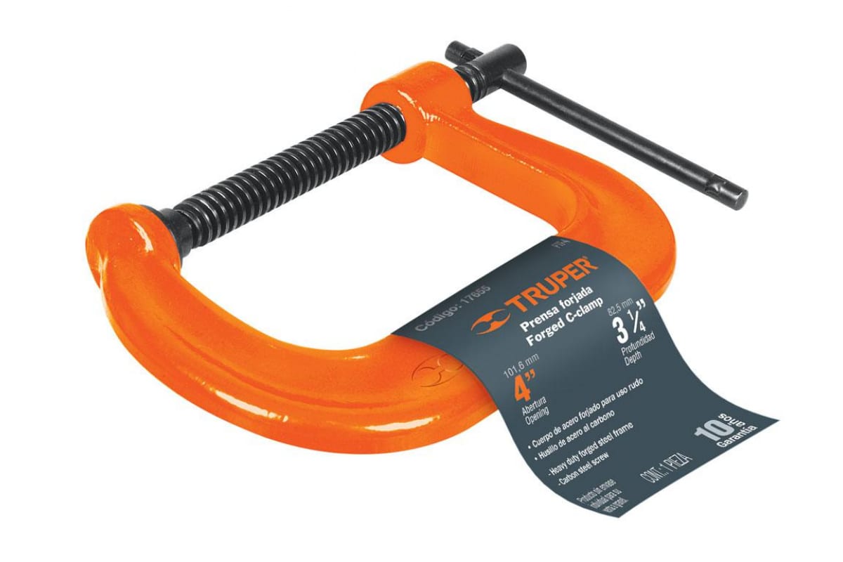 Усиленная струбцина TRUPER 17655 имеет С-образную форму. Она используется для фиксации заготовок во время выполнения столярных или слесарных работ. Приспособление оснащено Т-образной рукояткой, обеспечивающей надежный хват. Материал струбцины - кованная сталь.