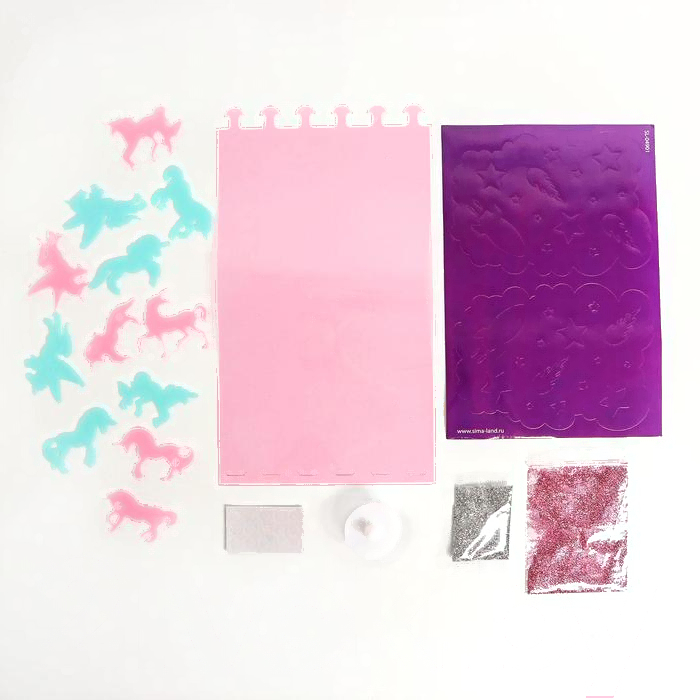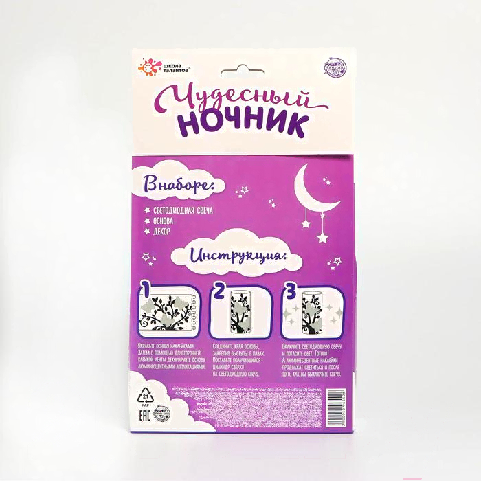 • Комплектация основа/заготовка (лист пластика), инструкция, расходные материалы/ингредиенты (лист с наклейками, клейкая лента), детали для сборки (светодиодная свеча, фигурки)