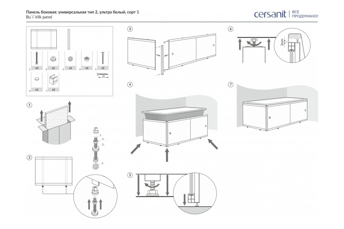 Боковая универсальная панель Cersanit тип 2 70 ультра белый PB-TYPE2x70-W отлично скрывает сантехнические соединения и дополнительное оборудование, что придает ванне законченный вид.