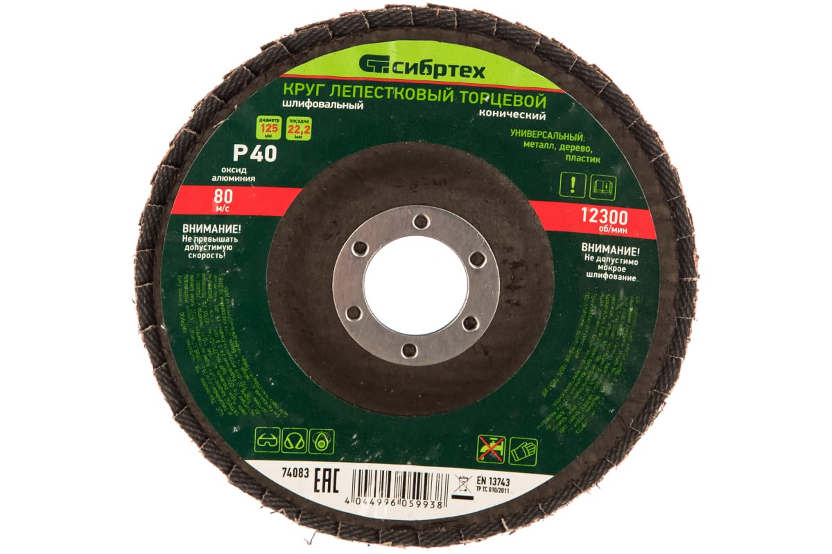 Круг лепестковый торцевой, конический (125x22.2 мм; P40) СИБРТЕХ 74083