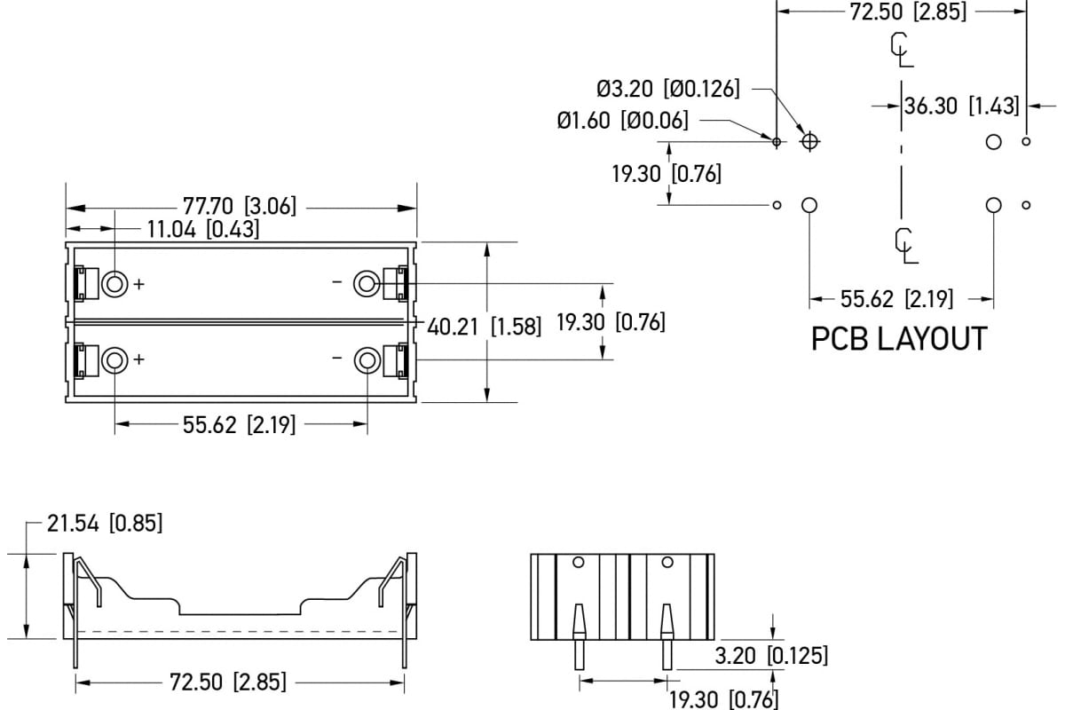 Батарейный отсек REXANT 2x18650 Li-ion на плату 16-0802-9 с отдельными контактными площадками для двух незащищенных литий-ионных (Li-ion) аккумуляторов типоразмера 18650 используется для подключения питания в различном оборудовании (в том числе в бытовых устройствах, игрушках и радиоуправляемых моделях). Отсек предназначен для монтажа методом пайки непосредственно на печатную плату. Отдельные контактные площадки позволяют суммировать питание аккумуляторов или разводить по необходимости. Температурный диапазон -40...+105 °C.