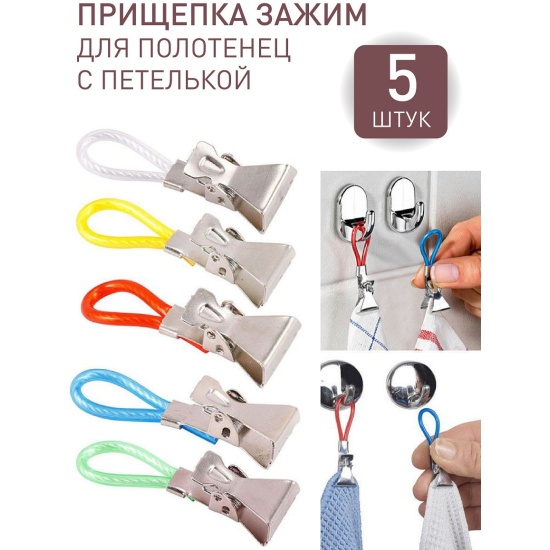Яркий и компактный набор из 5 прищепок с разноцветными с петлями. Высота 5 см., ширина 1.5 см. Отлично подойдут для полотенца. Стальной зажим надежно фиксирует изделие и не дает ему выскользнуть.