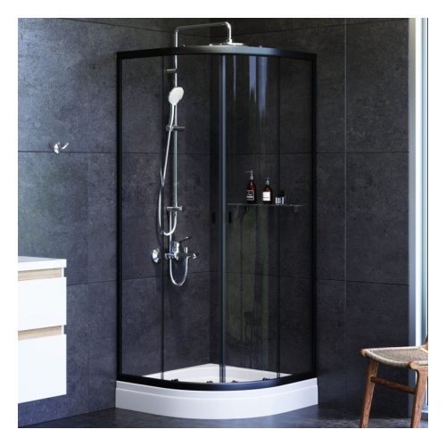 Габариты (ШхВхД): 80 х 200 х 80 см.Ширина входа: 48 см.Форма: четверть круга.Материал профиля: алюминий.Полотно двери изготовлено из прозрачного закаленного и безопасного стекла толщиной 4 мм. Фактура гладкая, стекло прозрачное.Профиль из анодированного алюминия хорошо противостоит отложению водного камня и образованию ржавчины.Способ открывания дверей - раздвижной.Поддон акриловый на каркасе, со съемным экраном.Глубина поддона: 5 см.Диаметр слива: 5,2 см.Стильные ручки из ABS-пластика черного цвета.Монтаж осуществляется на поддон, вплотную к стене. Универсальная установка.