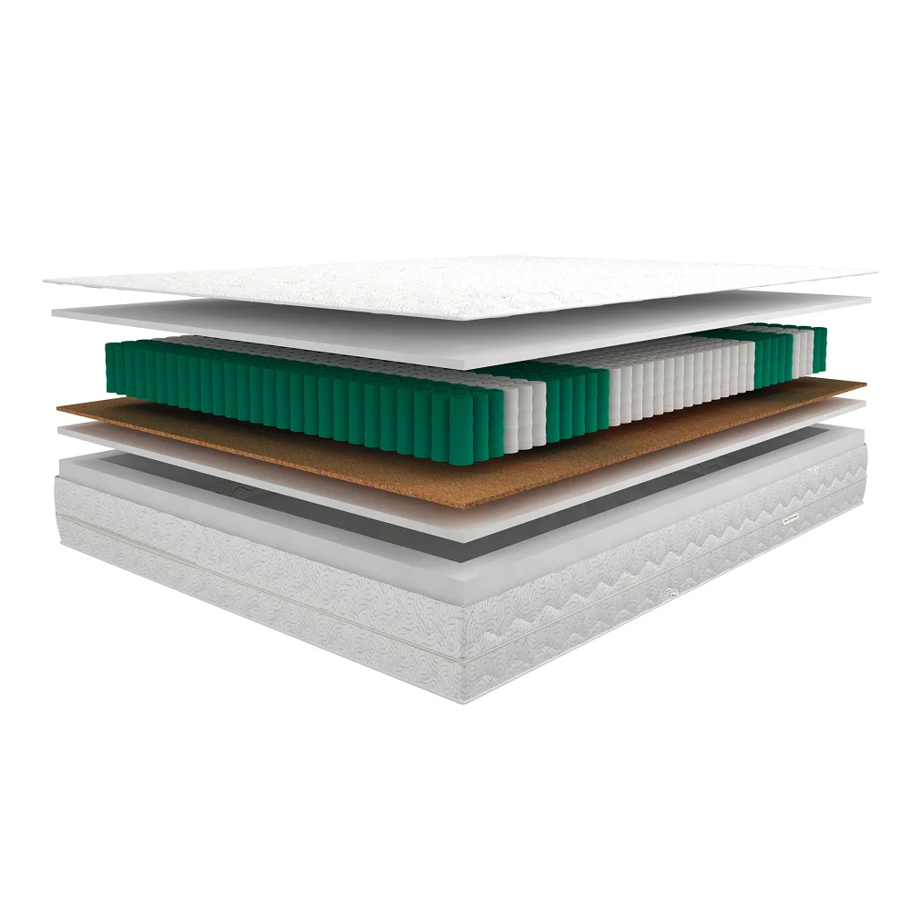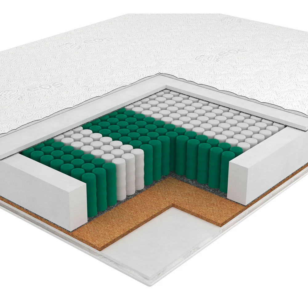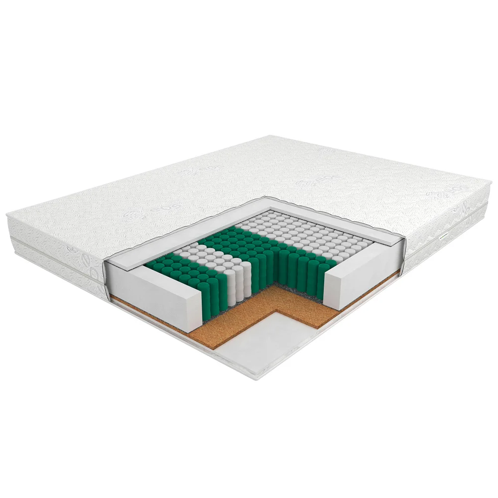 Среднежесткий ... средний, двухспальный / односпальный, ширина 70 ... 200 см, длина 160 ... 200 см, высота 20 см, базовый блок: независимые пружины, настилочные материалы: пенополиуретан (поролон). Кокосовая койра., тип ткани чехла: трикотаж (или жаккард). Стёганый чехол.