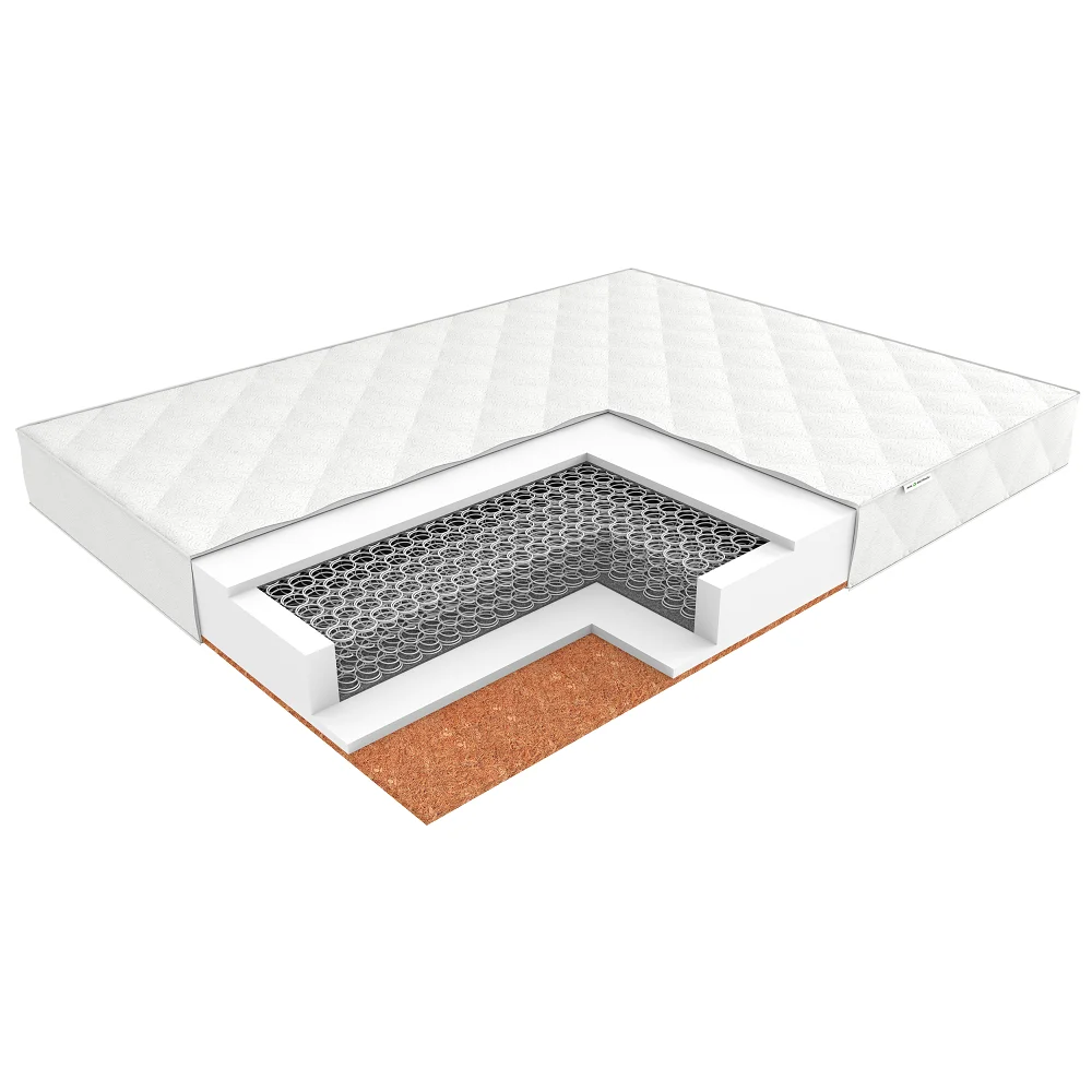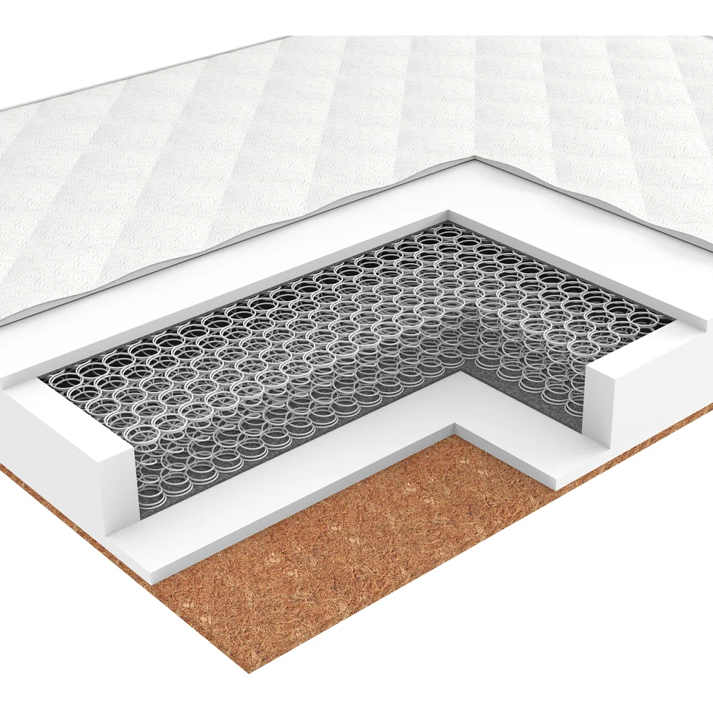 Среднежесткий ... средний, двухспальный / односпальный, ширина 70 ... 200 см, длина 160 ... 200 см, высота 20 см, базовый блок: зависимые пружины, настилочные материалы: пенополиуретан (поролон). Кокосовая койра. Спанбонд. Хлопковое полотно (х/б ватин)., тип ткани чехла: жаккард. Стёганый чехол.