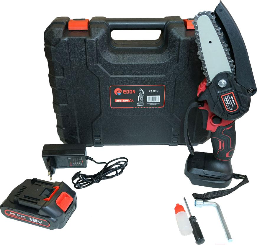• В комплекте шина, цепь, ключ, зарядное устройство, отвертка, кейс, смазка