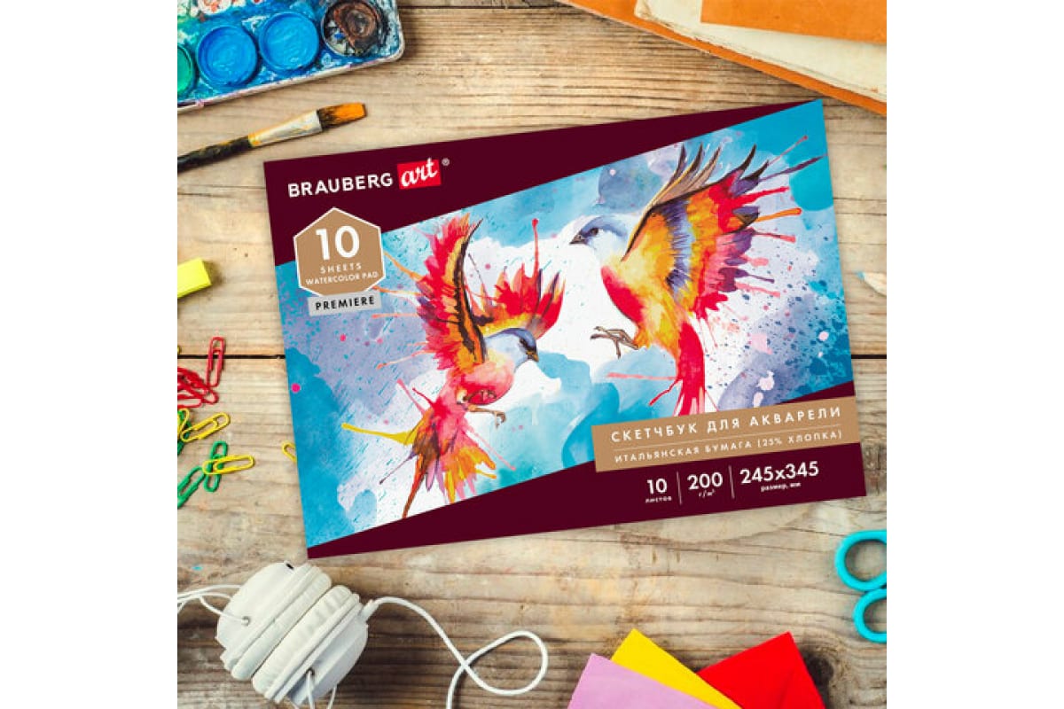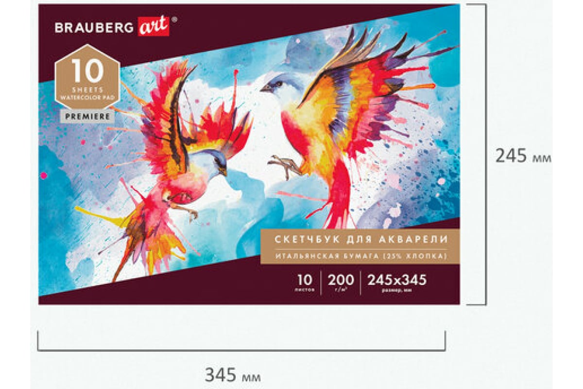 Альбом для акварели BRAUBERG ART PREMIERE бумага ИТАЛИЯ 200 г/м 25 хлопок 245х345 мм, 10 листов 105911