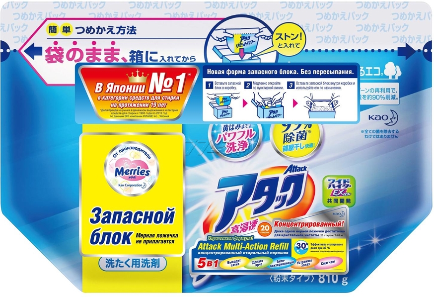 Стиральный порошок ATTACK Multi-Action Сменный блок 0,72 кг (4901301364661) подходит для стирки одежды всей семьи. Проникает глубоко в волокно и вымывает въевшуюся грязь, засаленность и неприятные запахи. Концентрированный стиральный порошок с активным кислородным пятновыводителем и кондиционером предотвращает пожелтение белья, удаляет сложные загрязнения и устраняет затхлый запах у полотенец во время использования. Позволяет избежать появления неприятного запаха при сушке в помещении. Обладает нежным цветочным ароматом. Не содержит фосфатов и хлора. Используйте запасной блок, если у вас есть коробка от порошка Attack Multi-Action.