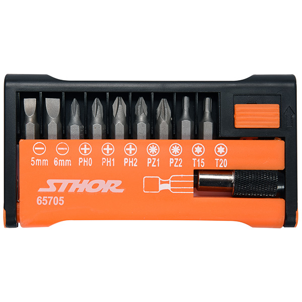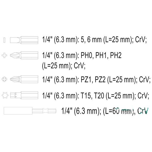 В наборе 10 предметов: SL5 (1 шт.), SL6 (1 шт.), PH0 (1 шт.), PH1 (1 шт.), PH2 (1 шт.), PZ1 (1 шт.), PZ2 (1 шт.), T15 (1 шт.), T20 (1 шт.), держатель 60 мм