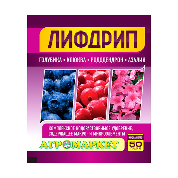Сухие водорастворимые удобрения «Лифдрип» предназначены для комплексного ухода за овощными, ягодными культурами и декоративными растениями на протяжении всего вегетационного периода. В минеральных удобрениях «Лифдрип» содержатся основные питательные вещества растений — азот, фосфор, калий, магний, железо, сера, кальций, — а также микроэлементы — бор, марганец, медь, молибден, цинк и др., не содержат хлора и тяжелых металлов. Правильный состав, учитывающий потребности растения в тот или иной период роста, своевременная подкормка голубики, клюквы, азалия удобрениями «Лифдрип» препятствуют образованию нитратов в растениях.