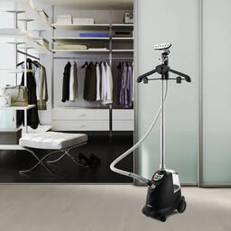 Напольный, бытовой отпариватель, 2200 Вт, объем 3000 мл, 45 мл/мин, время нагрева 60 с, съёмный резервуар для воды, телескопическая стойка, вешалка для одежды, щетка для очистки ткани, насадка для стрелок на брюках, варежка, зажимы для брюк.