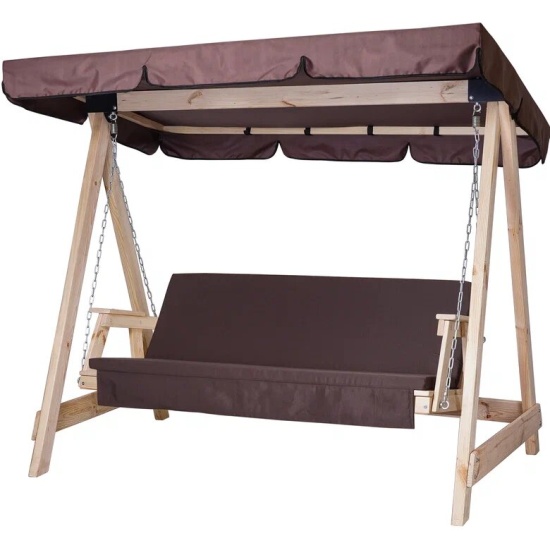 Садовые качели изготовлены из массива сухой сосны, материал используется без трещин. Конструкция качели разработана по принципу конструктора, легко собирается без специального инструмента. Все детали отшлифованы, нет острых углов. В комплекте имеется вся необходимая фурнитура, комплект деталей, тент, инструкция по сборке, паспорт изделия. Тент изготовлен из непромокаемой и устойчивой к ультрофиолетовому излучению ткани Oxford 600. Матрас изготовлен из европейской ткани с тефлоновым покрытием. Наполнитель матраса - холлофайбер.