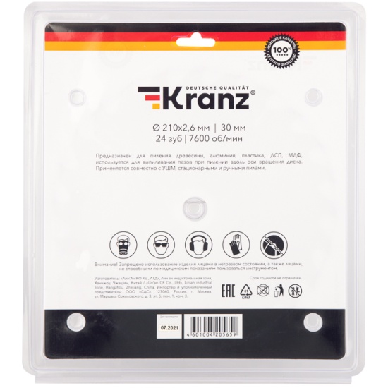 Пильный диск KRANZ предназначен для пиления древесины, алюминия, пластика, ДСП, МДФ. Используется для выпиливания пазов при пилении вдоль оси вращения диска. Применяется совместно с УШМ, стационарными и ручными пилами (особое внимание на допустимые обороты в минуту). Зубья оснастки оснащены твердосплавными напайками и имеют специальную заточку для качественной распиловки заготовок.