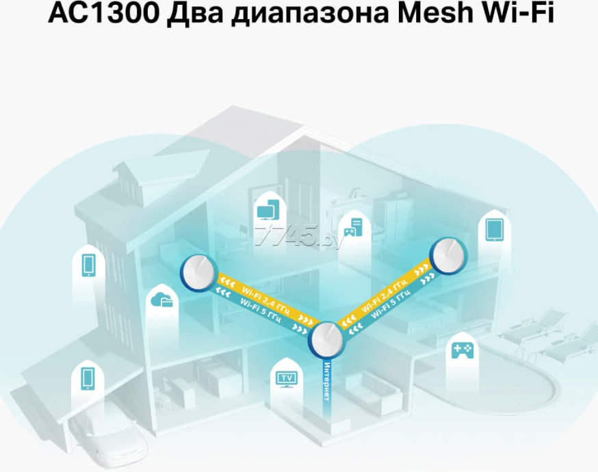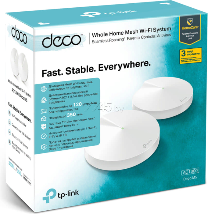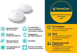 Wi-Fi система (MESH-система) TP-LINK Deco M5 (2-pack) – домашняя Mesh Wi-Fi система, состоящая из двух беспроводных маршрутизаторов, задача которых заключается в обеспечении сплошной зоны покрытия беспроводной сети на большой территории. Благодаря современной Mesh-технологии модули Deco образуют единую домашнюю сеть с одним именем. Ваши устройства будут автоматически переключаться между разными модулями Deco на высокой скорости, куда бы вы ни пошли. Комплект Deco M5 с двумя устройствами обеспечивает покрытие до 350 кв. м. Если этого недостаточно – просто добавьте в сеть больше модулей Deco для увеличения покрытия. Deco M5 обеспечивает быстрое и стабильное соединение со скоростью до 1267 Мбит/с. Deco способен поддерживать работу даже самой загруженной сети, обеспечивая одновременное соединение для более чем 100 устройств. TP-Link HomeCareTM предоставляет возможности дополнительной защиты, включая родительский контроль, встроенный антивирус и приоритезацию данных (QoS). Настройка еще никогда не была такой простой благодаря мобильному приложению Deco.
