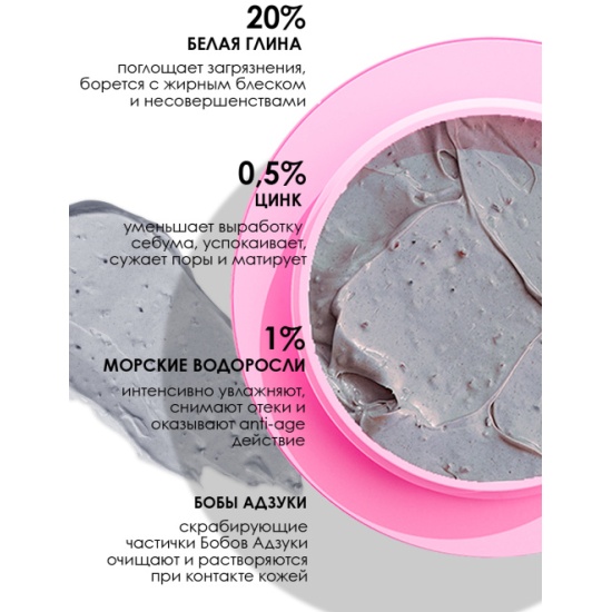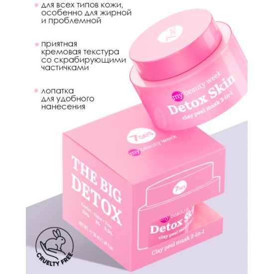 Маска для лица 7DAYS MY BEAUTY WEEK DETOX SKIN очищающая с глиной 2-в-1, 50 млМаска для лица 7DAYS DETOX SKIN – глубокое очищение и SMART уход за кожей from Korea with love.Специальная «умная» формула 2 в 1 работает как глиняная маска + скраб для лица.SMART уход MY BEAUTY WEEK – это сочетание «умных» ингредиентов и инновационных формул для 100% эффективности:Белая Глина (Каолин) – бережно вытягивает загрязнения, сужает поры и подсушивает.Цинк – борется с несовершенствами и регулирует выработку себума.Морские Водоросли (Ламинария, Фукус) – направлены на восстановление кожного баланса, лифтинг, увлажнение лица.100% натуральные частички – Бобы Адзуки мягко отшелушивают и растворяются при контакте с кожей.Детокс-маска – настоящее спасение для проблемной кожи: выравнивает тон, матирует, смягчает и придает естественное сияние.