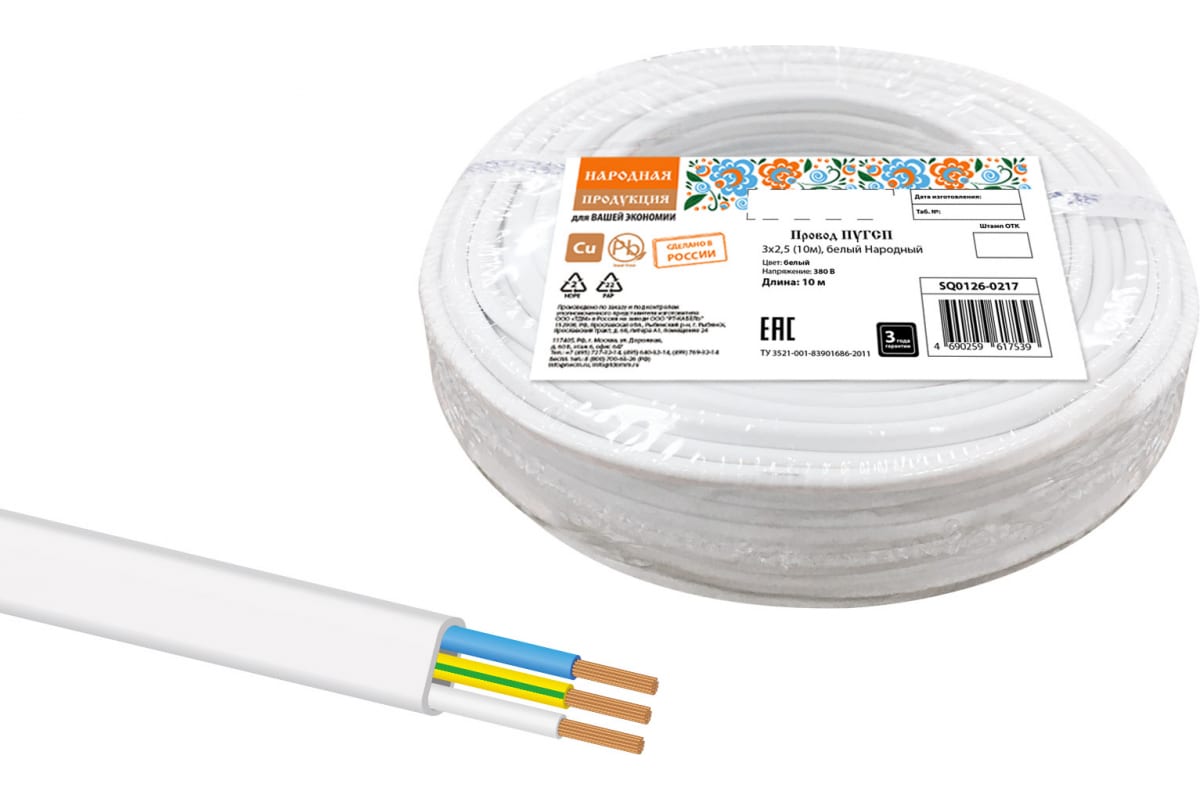 Провод ПУГСП TDM 3x2,5 10м, белый Народный SQ0126-0217