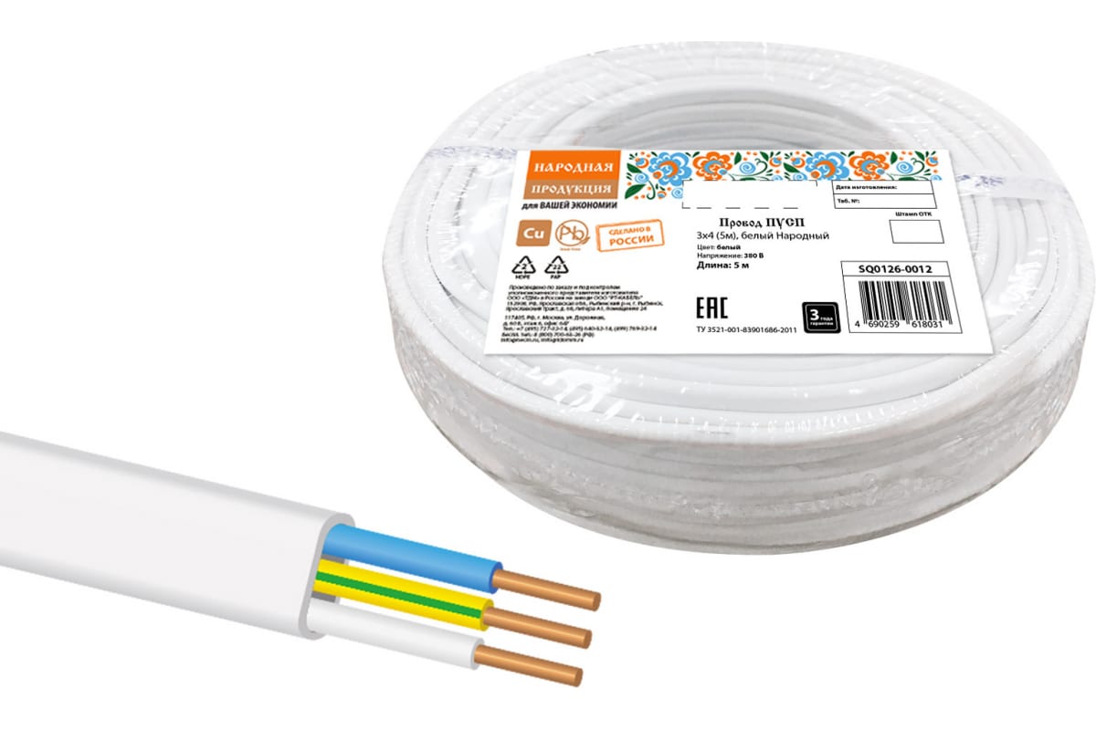Провод ПУСП TDM 3x4 5м, белый Народный SQ0126-0012 для прокладки в осветительных сетях, монтажа и присоединения приборов к сети переменного тока на номинальное напряжение до 380 В частотой 50 Гц. Соответствует требованиям ГОСТ 26445-85. Соответствует требованиям пожарной безопасности ГОСТ 31565-2012.