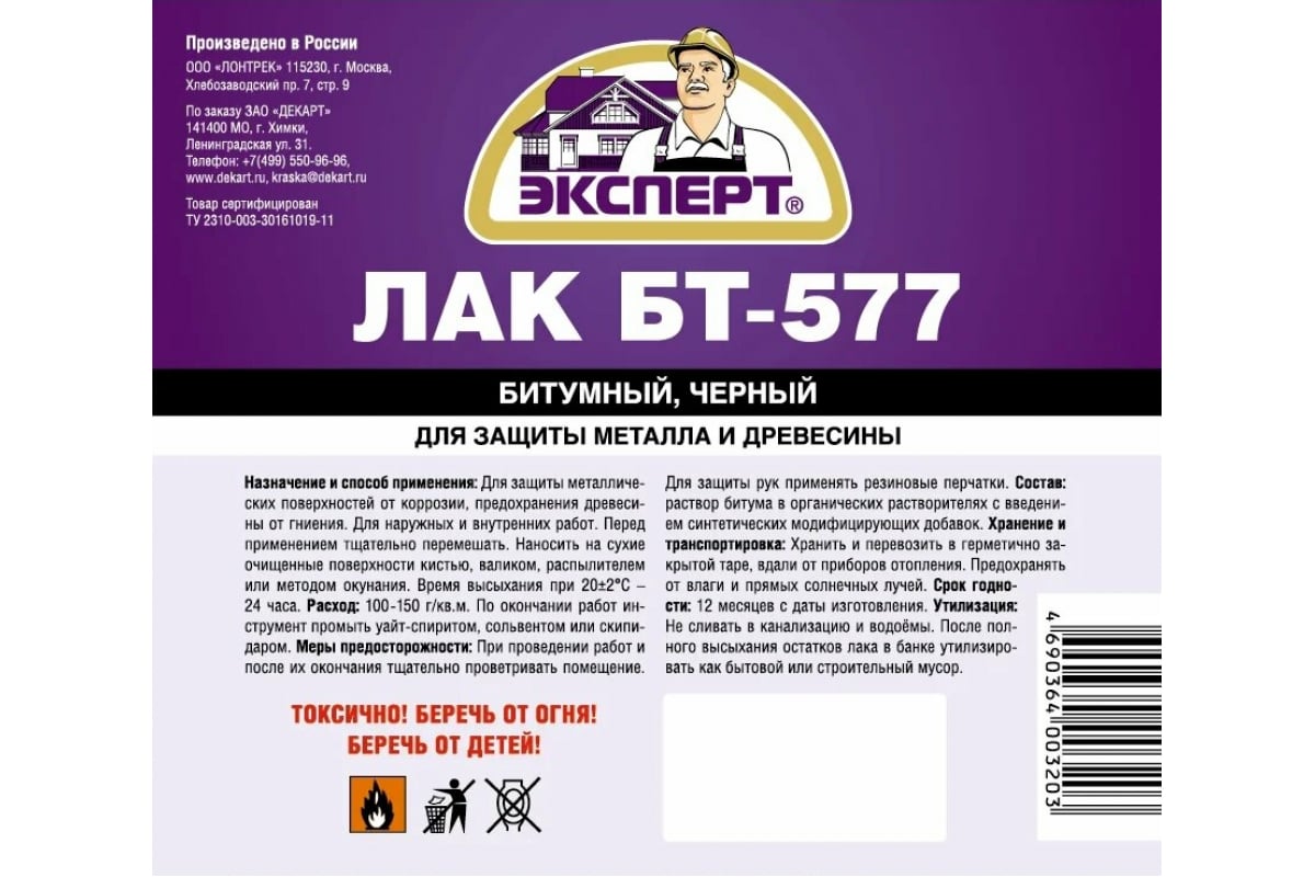 Битумный лак ЭКСПЕРТ БТ-577 10 л 18228 применяется для защиты металлических поверхностей от коррозии при хранении и транспортировке, для изготовления алюминиевой краски, а также для предохранения древесины от гниения снаружи и внутри помещений.