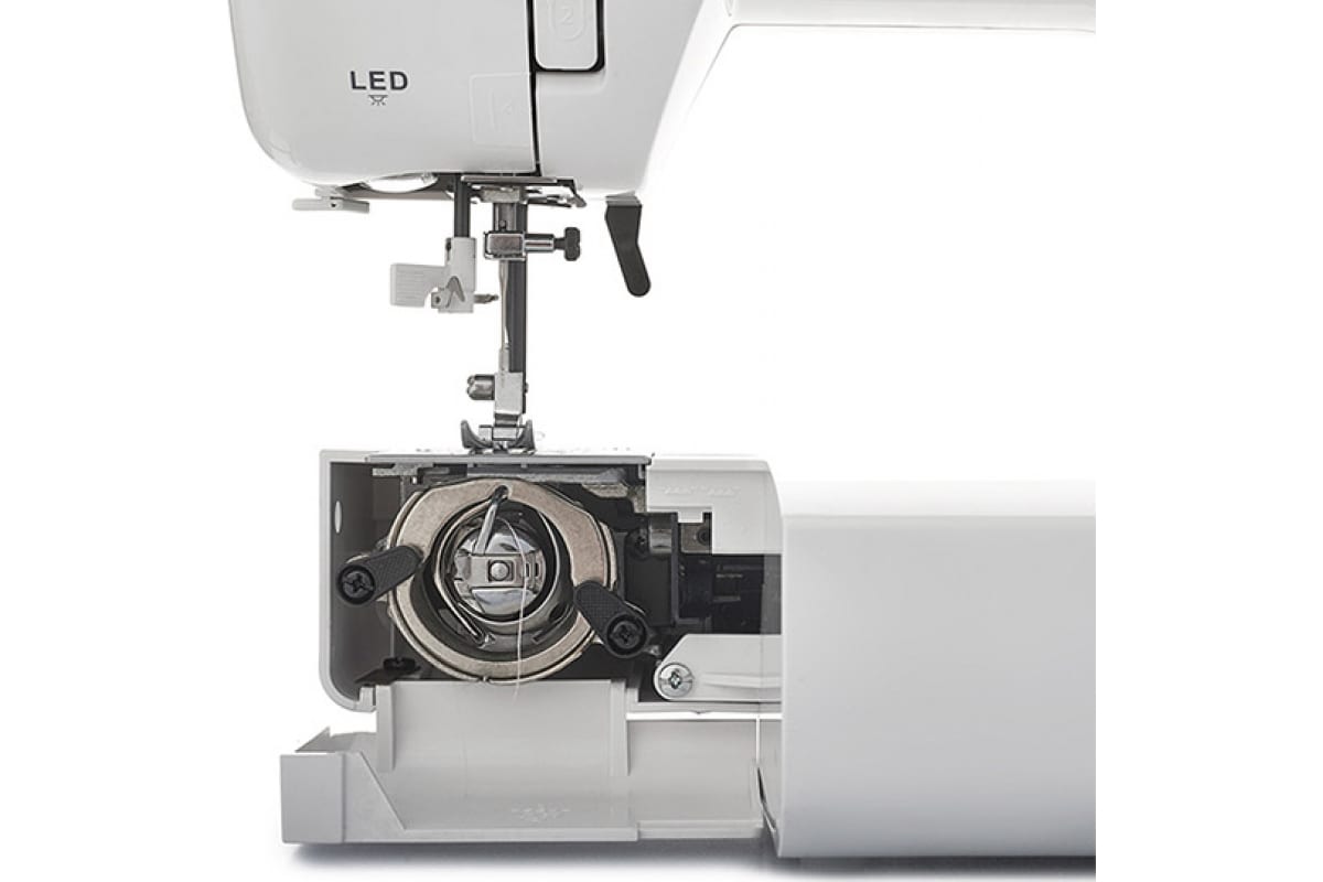 Данная модель оснащена вертикальным классическим челночным устройством. Благодаря встроенному нитевдевателю можно без труда вдеть нить в иглу.