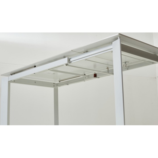 вставка 50 см выдвигается из-под столешницы с одной стороны столешницы;Столешница "под мрамор" глянцевая, толщина столешницы 12 мм, не царапается, не впитывает жидкость, легко моется, не боится перепадов температур;основание стола - металл, цвет - белый, ножки стола расположены по углам столешницы под углом