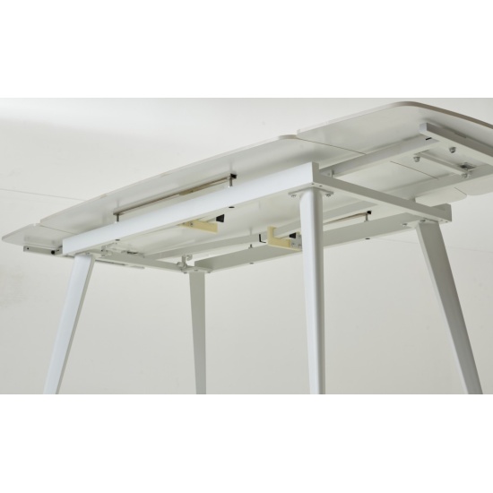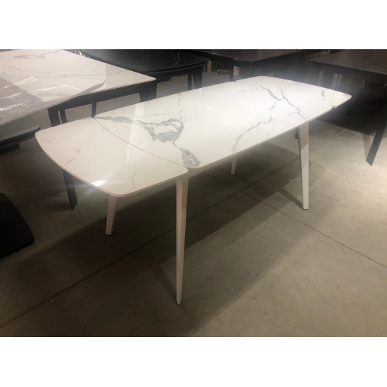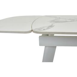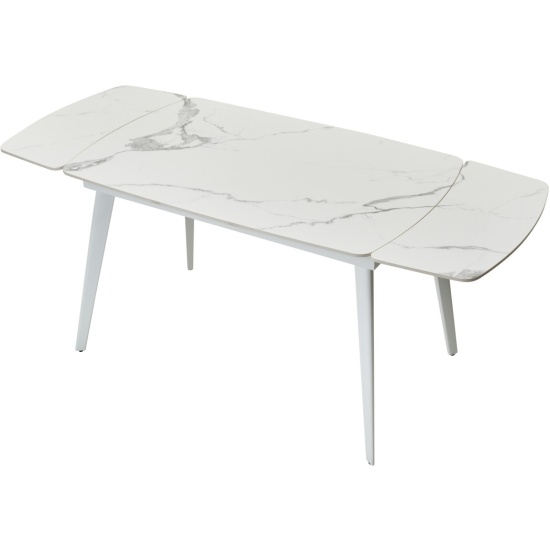 раскладывается по бокам столешницы, две вставки по 30 см;керамическая столешница "под мрамор" глянцевая, толщина столешницы 11 мм;основание стола - металл, цвет - белый;