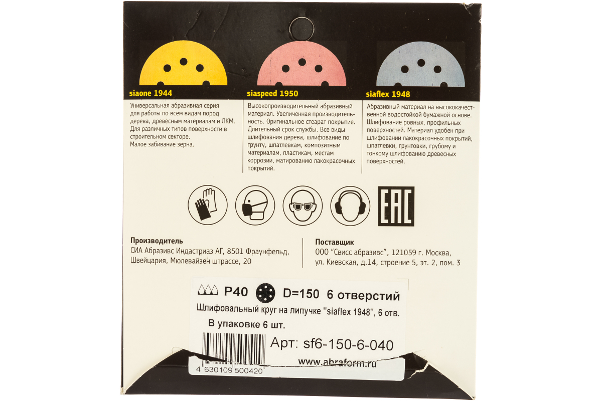 Круг шлифовальный на липучке siaflex 1948 (5+1 шт; 150 мм; 6 отверстий; P40) sia Abrasives sf6-150-6-040