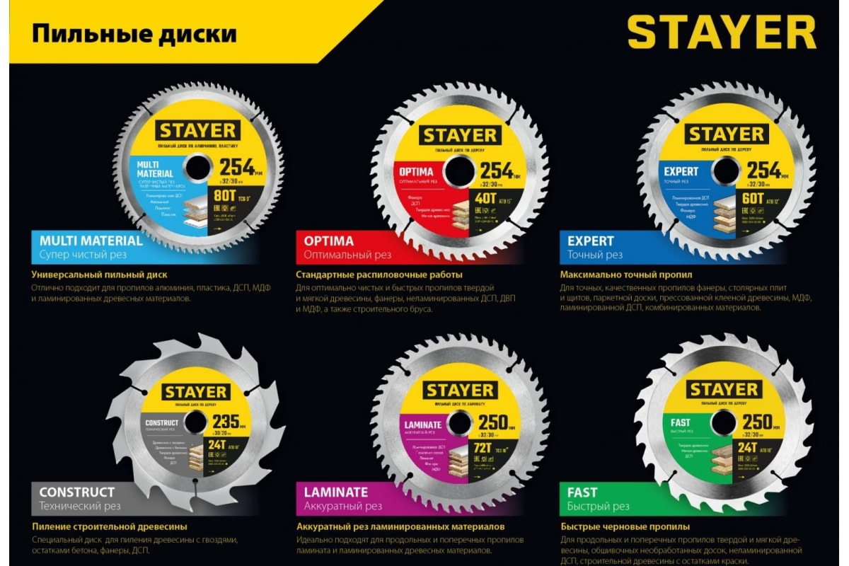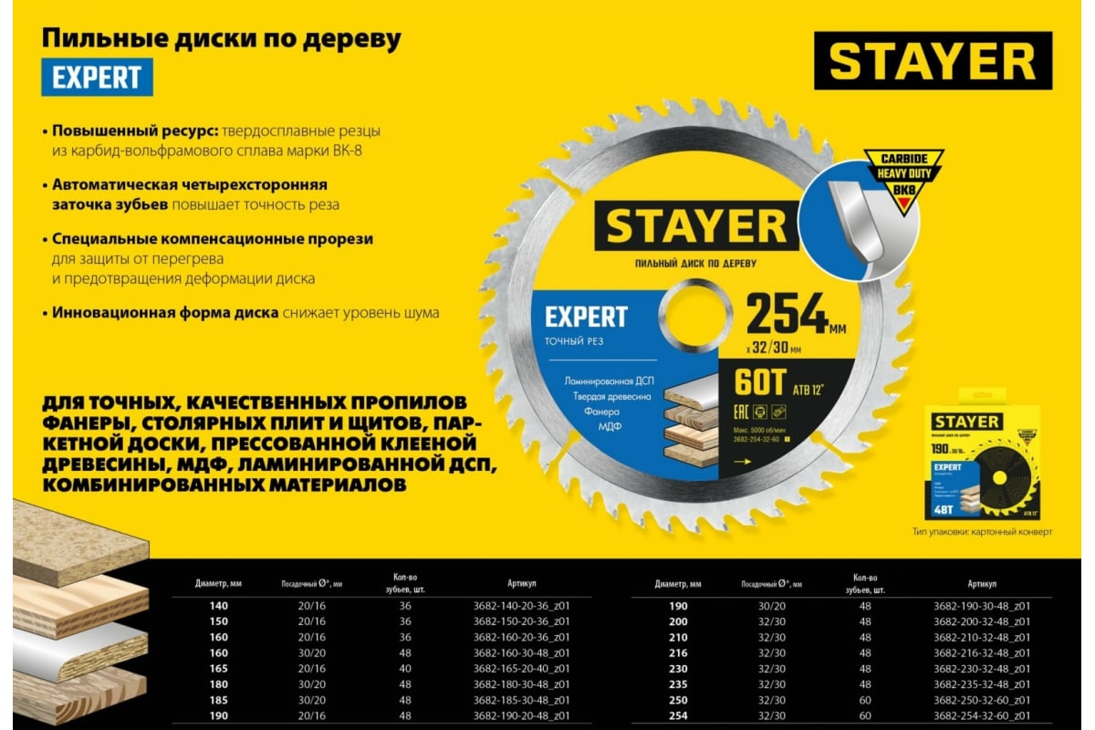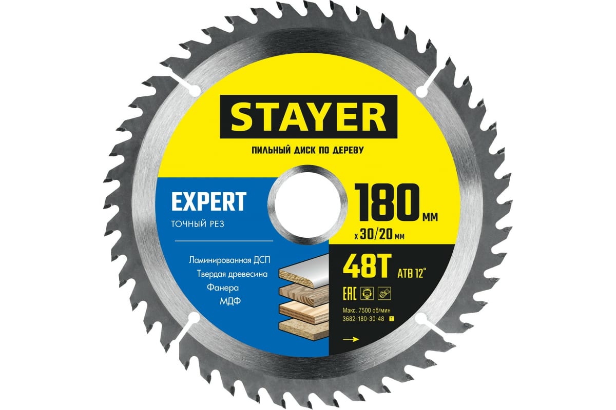 Диск пильный по дереву STAYER Expert 180x30/20 мм, 48Т 3682-180-30-48_z01 отлично подходит для точных, качественных пропилов фанеры, столярных плит и щитов, паркетной доски, прессованной клееной древесины, МДФ, ламинированной ДСП, комбинированных материалов.