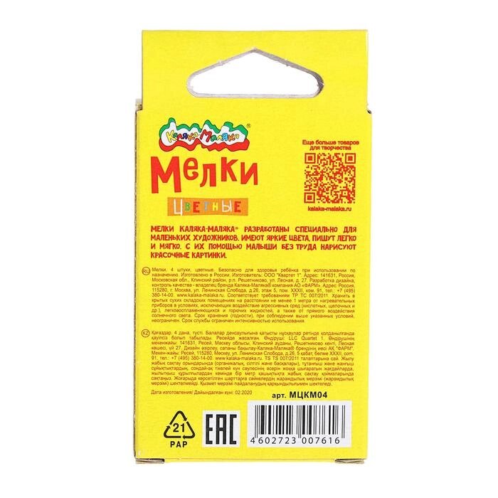 Мелки цветные в наборе 4 штуки, «Каляка-Маляка» квадратные