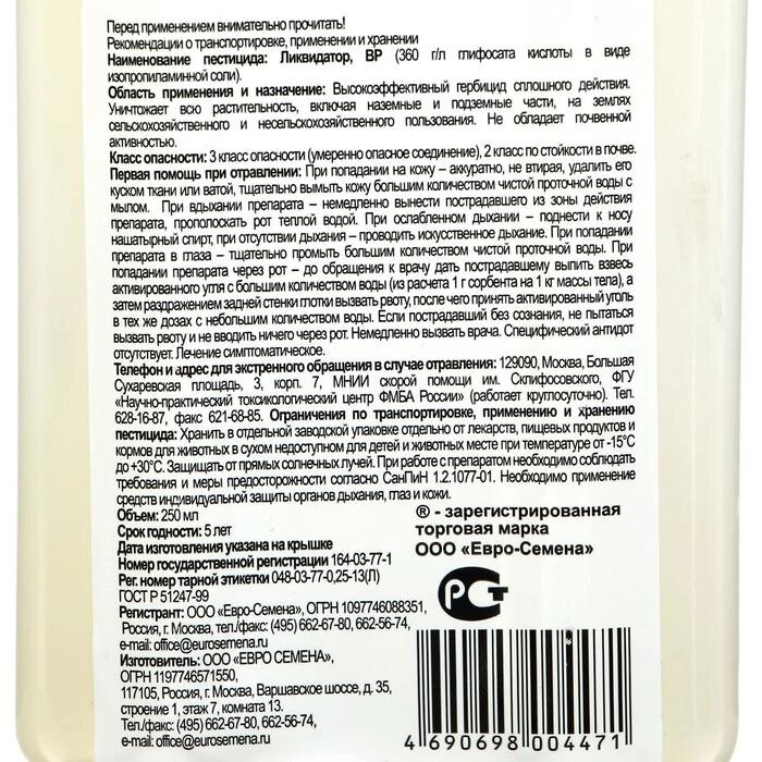 Средство сплошного уничтожения сорняков "Ликвидатор", 250 мл