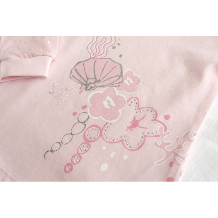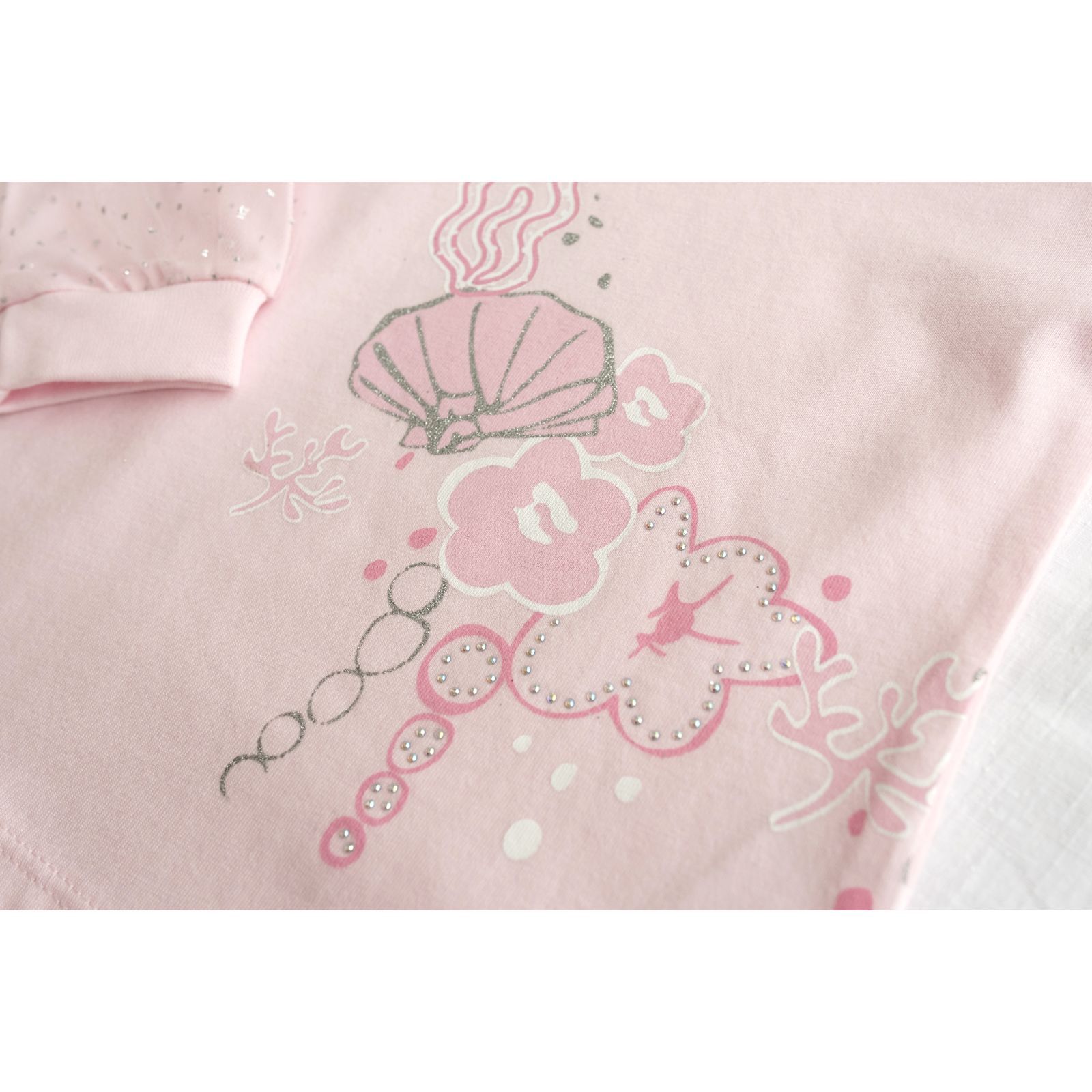 Кофтинка прямого силуету, з довгими рукавчиками-реглан на манжетах, прикрашена дуже милим, симпатичним, об'ємним принтовим малюнком з блискучими глітерними деталями і дрібними стразиками. Еластична кругла горловина оформлена трикотажною бейкою. На спинці застібається на ґудзик.