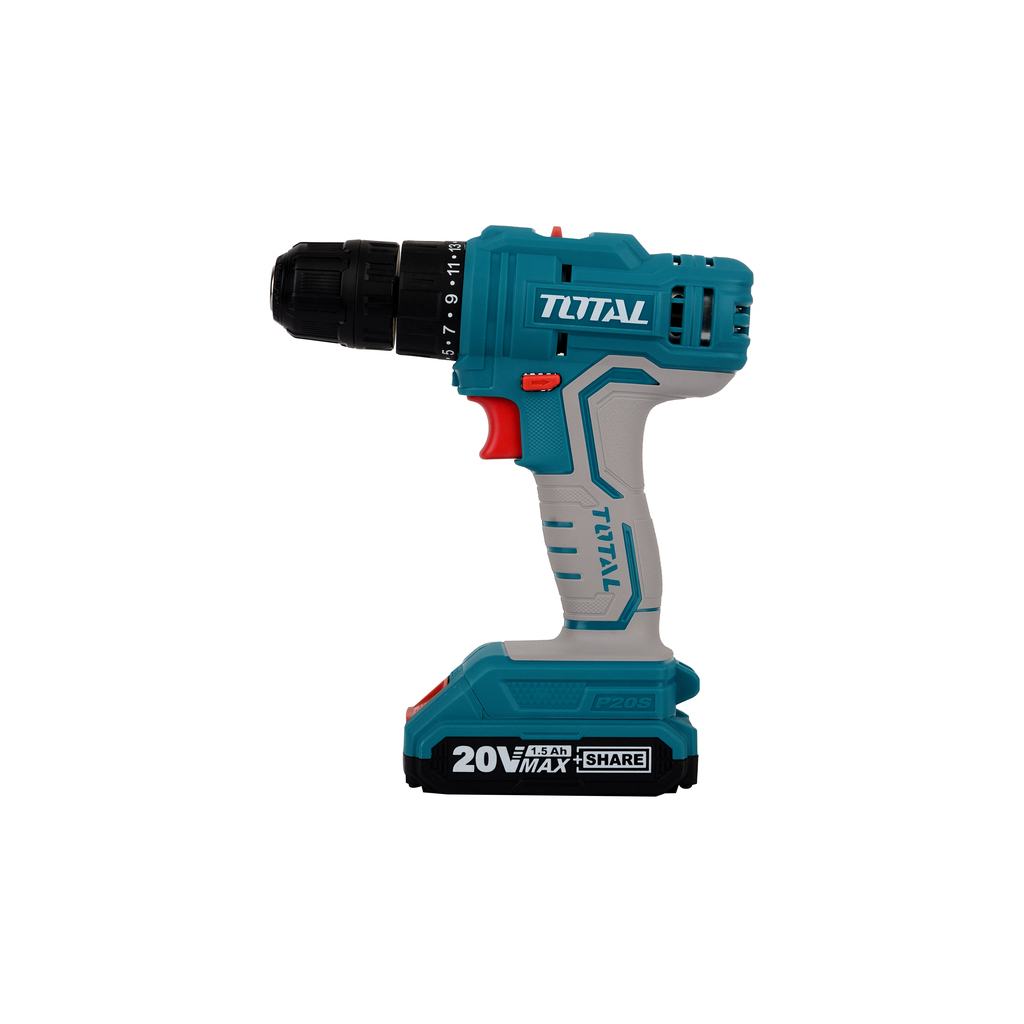 Акумуляторний шуруповерт TOTAL TDLI20011 живиться від літій-іонного акумулятора ємністю 1.5А, працюючи навіть далеко від електромереж. Максимальний момент, що крутить, даної моделі 45 Нм. Працює у двох швидкісних режимах: до 400 та до 1500 об/хв. Швидкість обертання регулюється в діапазоні значень від 1 до 16. Швидкозатискний патрон дозволяє оперативно та надійно закріплювати біти та свердла діаметром від 0,8 до 10 мм. кнопка включення, перемикач реверсу та кнопка блокування розташовані на зручній пістолетній рукоятці. В комплектацію входять шуруповерт, акумулятор, зарядний пристрій, інструкція та гарантійний талон.