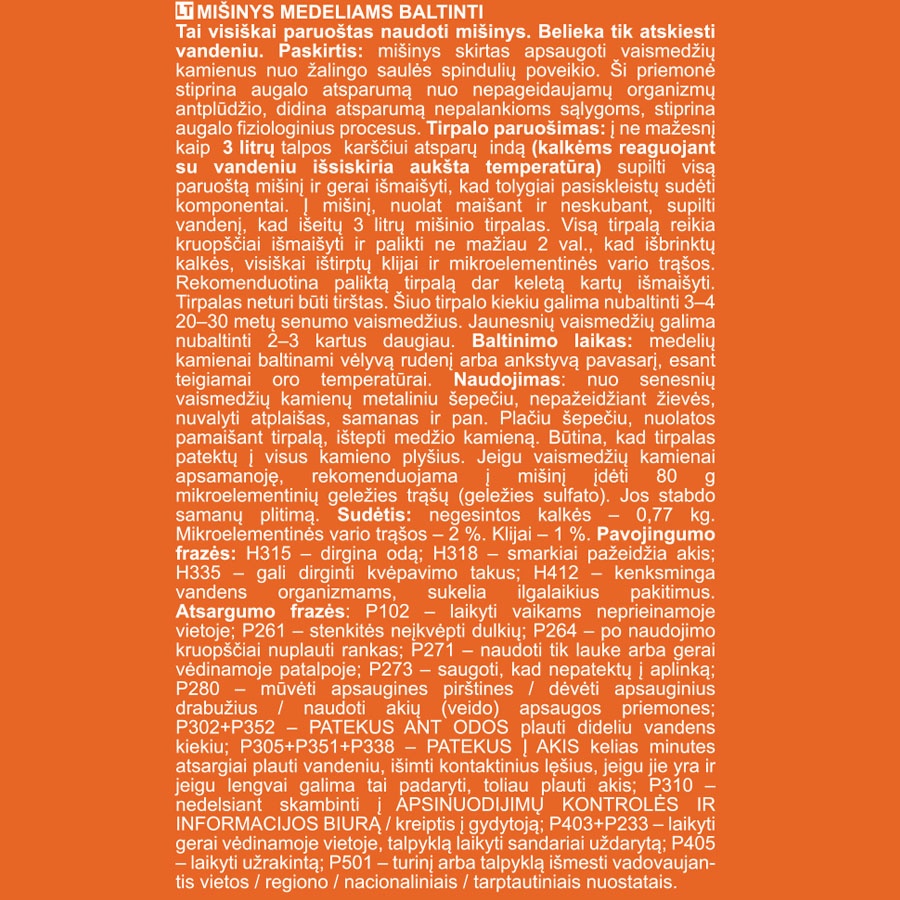 - Paskirtis Skirtas 10 l tirpalo. Mišinys skirtas vaismedžiams apsaugoti nuo įvairių grybelinių ligų, kenkėjų ir žalingo temperatūros svyravimo pavasarį.