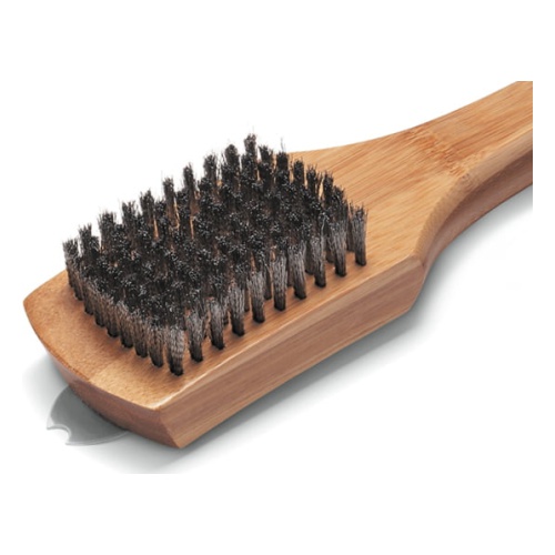 Щетка, предназначенная для очистки решетки для приготовления, имеет ручку из бамбука, щетинки из нержавеющей стали и скребок с зазубринами для особенно сильных загрязнений.