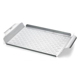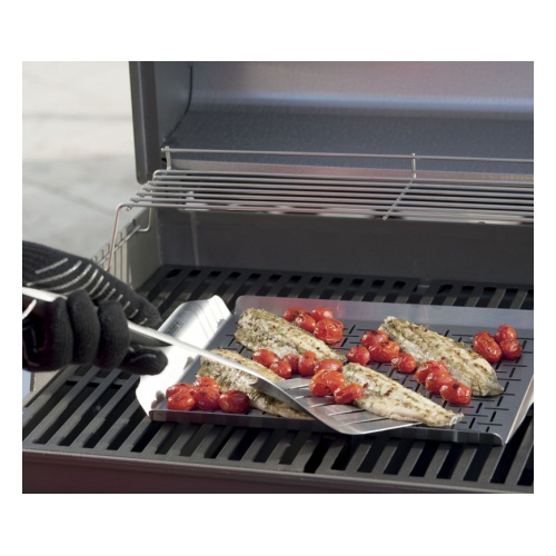 На перфорированном противне для гриля очень удобно готовить рыбное филе и любые продукты, нарезанные кусочками. Это существенно расширяет список блюд и гарниров, которые вы можете приготовить на гриле. Причем делать это можно одновременно. Если противень предварительно хорошо разогреть, блюдо прекрасно подрумянится и пропитается изумительным ароматом барбекю, который свободно проникает сквозь отверстия. Идеально для приготовления рыбного филе или других нежных продуктов, нарезанных овощей или грибов, которые без такого приспособления попросту провалятся сквозь решетку.