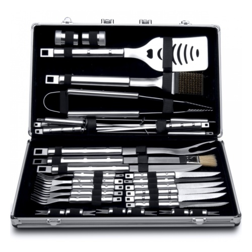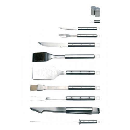 Полный набор инструментов сделает любой ужин на свежем воздухе успешным событием. На гриле кукурузные початки? Воткните вилочку в основание початка и вы получите возможность элегантно откусывать горячие и липкие зернышки, не касаясь их. 6 небольших вилок и ножей несомненно предназначаются для того, чтобы помочь вам насладиться кулинарными результатами ваших стараний у гриля. Вилка и нож для мяса тоже представлены в линии барбекю. Эти инструменты пригодятся для нарезания запеченного мяса или переворачивания и нарезания овощей на гриле. Лучше не использовать вилку для переворачивания мяса, поскольку это может привести к тому, что из отверстий прокола вытекут соки, и мясо может стать сухим и твердым. Проволочная щетка делает чистку гриля практически удовольствием. Длинная широкая лопатка с отверстиями поможет Вам приподнять самые деликатные продукты, например, рыбу, которая бы распалась на кусочки, если бы вы использовали щипцы. И опять же, ручка достаточно длинная, помогает держать ваши руки подальше от раскаленной поверхности. Маленькая мягкая кисть идеальна для намазывания и нанесения маринадов. Щипцы - один из самых необходимых инструментов для гриля: зазубренный край обеспечивает надежный захват при переворачивании продуктов в процессе гриллования, в то время как длинная ненагревающаяся ручка позволяет держать ваши руки на безопасном расстоянии от огня. Шампуры необходимы, когда вы хотите приготовить шашлык. Их ручки не нагреваются, а лезвия плоские. Плоские лезвия имеют преимущество, фиксируя пищу при переворачивании шампура. Поскольку металл проводит тепло в центр кажного кусочка, результатом будет равномерно прожаренный шашлык. Благодаря кейсу или складной сумке вы никогда больше не растеряете своих инструментов.