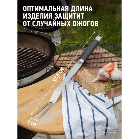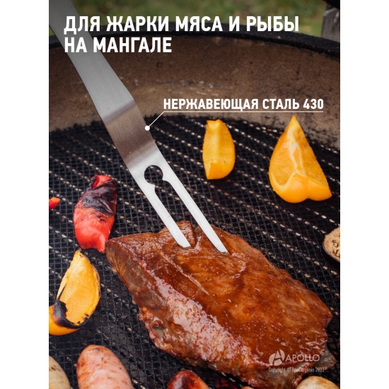 Вилка для барбекю APOLLO "Ribeye" RBY-01Вилка предназначена для переворачивания продуктов на гриле, мангале или жаровне. С помощью вилки удобно проверять степень готовности блюд. Рабочая часть вилки изготовлена из нержавеющей стали и выдерживает высокие температуры. Изделие имеет оптимальную длину для безопасного использования, рукоятку с противоскользящим покрытием и петлю для подвешивания. Особенности:Материалы изготовления: нержавеющая сталь 430, пластик TPR. Размеры изделия: 49,5х3х2,3 см