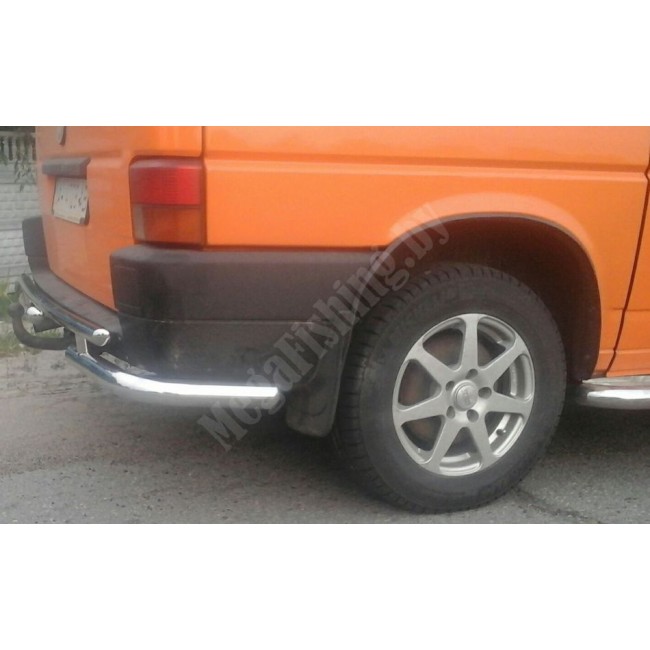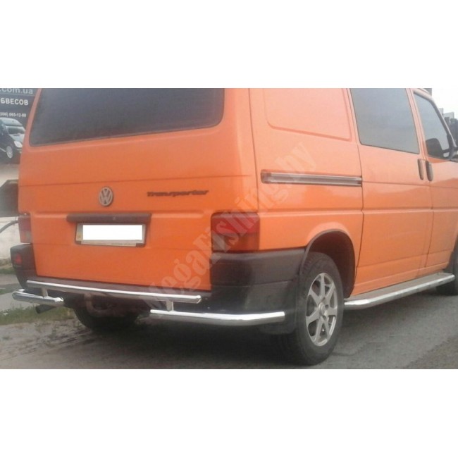Задняя защита B1-10 для Volkswagen Transporter T4 (1990-2003) d60/42 мм. Материал обвеса - нержавеющая сталь марки AISI 304 коррозийно-стойкая жаропрочная, что позволяет не опасаться коррозии. Однако для гарантированного сохранения внешнего вида в условиях зимней эксплуатации и воздействия агрессивных сред рекомендуется регулярный уход с помощью полировочных паст для изделий из нержавеющей стали.