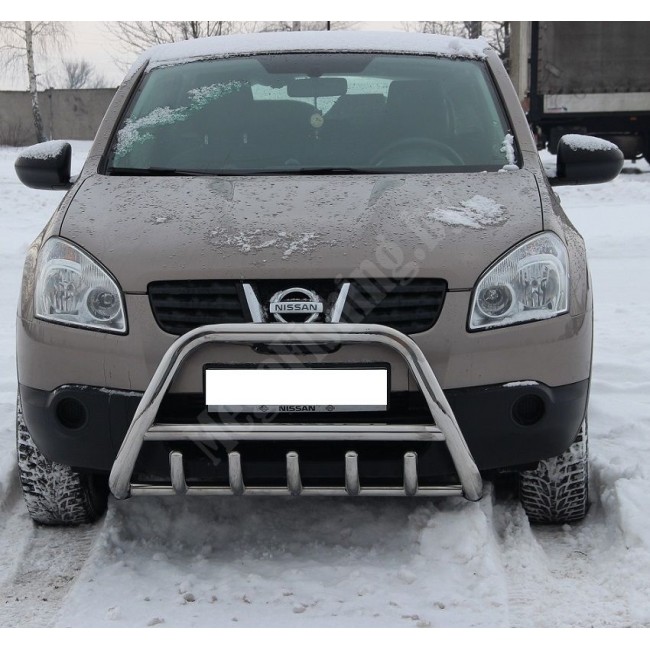 Кенгурятник F1-03 для Nissan Qashqai 1 (2006-2013) J10 d60/d40 - это внешний аксессуар, защищающий бампер от повреждений при небольших столкновениях, например с другим автомобилем в пробке.
