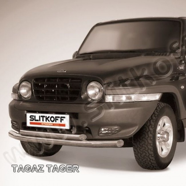 Защита переднего бампера D76+D57 двойная ТагАз TAGER (с 2008) - серебристая матов. Материал: Сталь покрытая полимерным покрытием серебристого цвета.