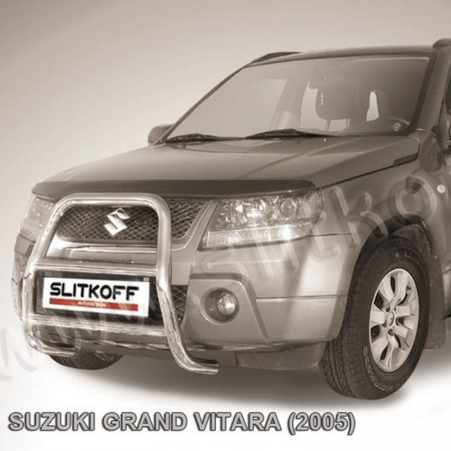 Кенгурятник D57 высокий Suzuki GRAND VITARA (с 2005) - серебристый матов. Материал: Сталь покрытая полимерным покрытием серебристого цвета.