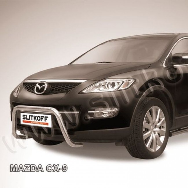 Кенгурятник D57 низкий "мини" Mazda CX-9 (с 2007) - серебристый матов. Материал: Сталь покрытая полимерным покрытием серебристого цвета.