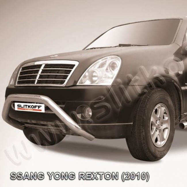 Кенгурятник D57 широкий "мини" SsangYong REXTON (с 2010) - серебристый матов. Материал: Сталь покрытая полимерным покрытием серебристого цвета.
