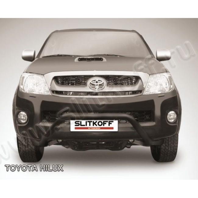 Кенгурятник D57 низкий широкий "мини" Toyota HILUX (с 2004) - черный. Материал: Сталь покрытая полимерным покрытием черного цвета.
