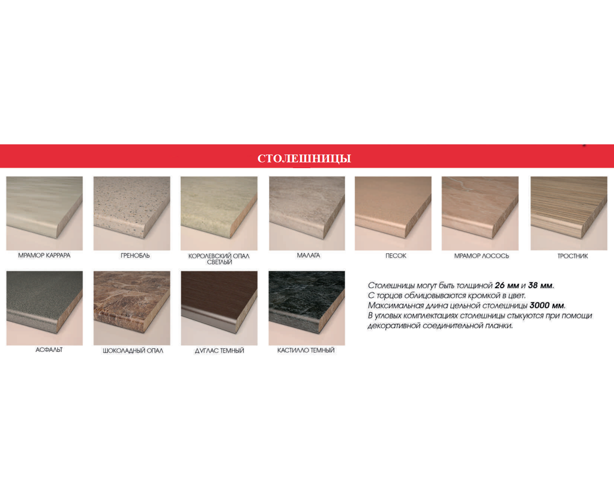 Обратите внимание!!! 1. Кухня комплектуется цоколями (ножки закрыты планкой) только при выборе корпуса в цвете: дуб сонома, орех, венге, графит (антрацит). При выборе корпуса в цвете: белый, серый, ваниль - кухня комплектуется хромированными металлическими ножками (только видимые ножки), без цоколя (цоколь можно приобрести самостоятельно пластиковый ПВХ). 2. За дополнительную оплату возможна замена столешницы толщиной 26мм на столешницу толщиной 38мм.