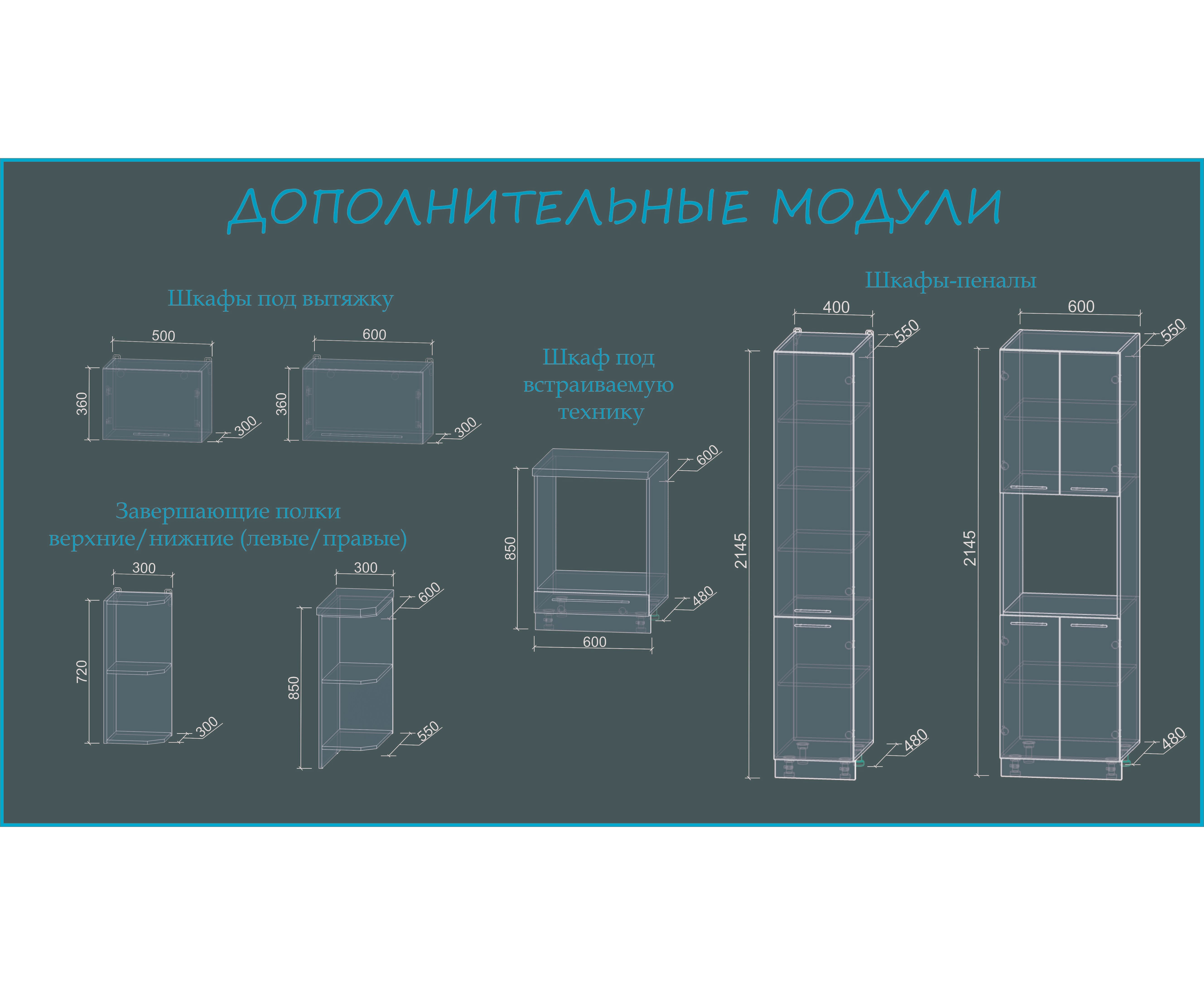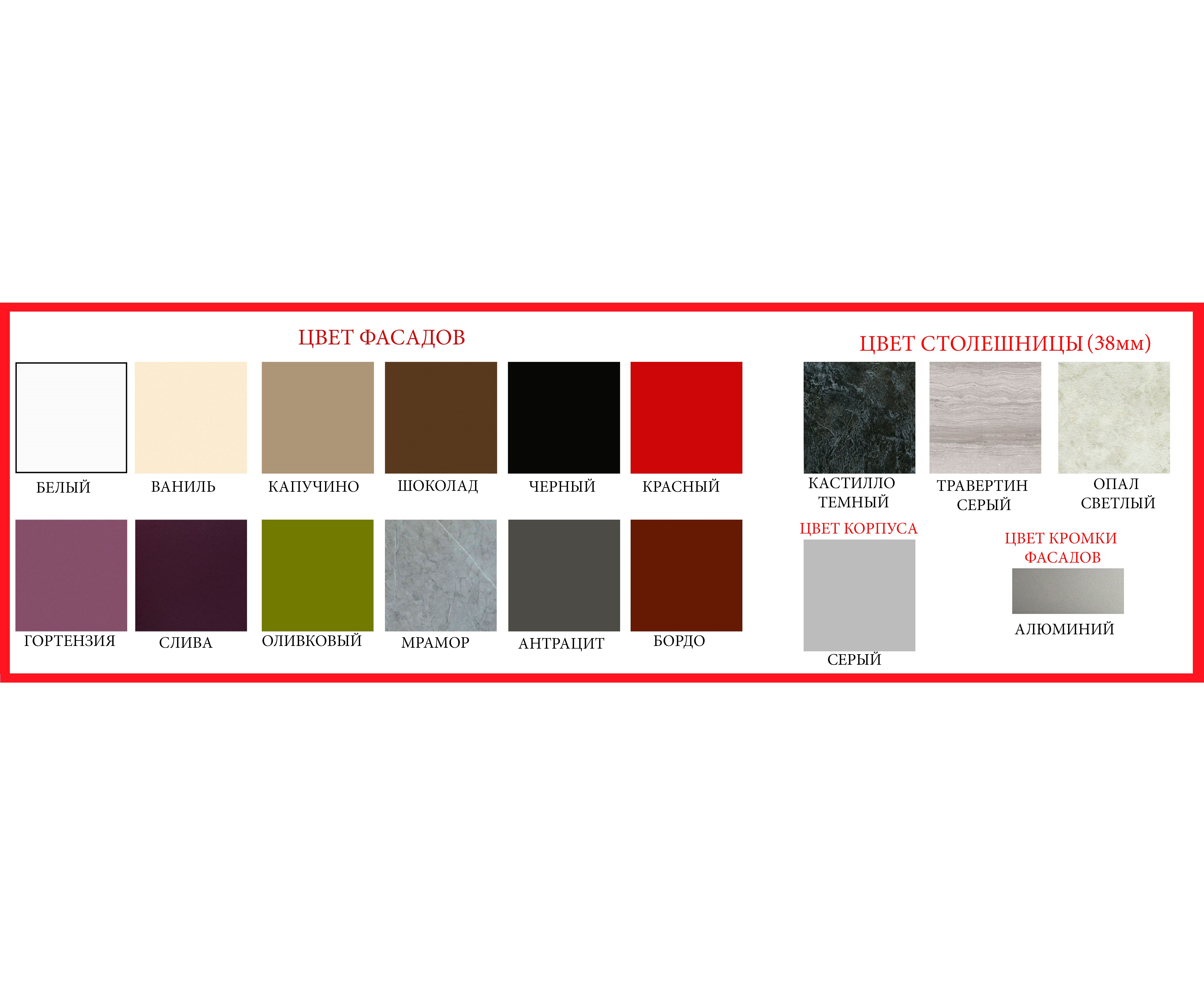 Обратите внимание: 1.Решетки для сушки посуды включены в основной комплект. 2. Кромка фасадов ПВХ толщиной 1мм, цвет алюминий. 3. Столешница 38мм влагостойкая, под врезную мойку. Поставляется одной, либо несколькими частями по желанию заказчика. 4. Кухня комплектуется направляющими шариковыми полного выдвижения, петлями с доводчиками. 5. Ручки релинг 128мм (на фасадах шириной 600мм включительно и более - 320мм). Цвет Матовый хром. 6. Для данной модели кухни предусмотрена модульная программа, что позволяет вносить изменения в стандартные готовые комплекты. Ассортимент и стоимость модулей уточняйте у менеджеров.